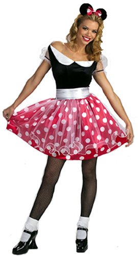 The sweetest mouse! Minnie Mouse costume features black velvet like bodice attached to red skirt with white polka dots and sheer overlay, sheer cap sleeves, Minnie Mouse cameo brooch and headband with ears and bow. Fits adults up to size 10. (Please note: Package states this fits up to size 14 but we've found this runs a bit small.)