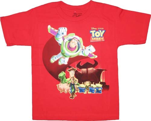 All of your favorite Toy Story characters are featured on this tee. Buzz Lightyear, Woody, Rex, Hamm, Slinky Dog, Zurg Robot and of course, the squeeze toy aliens.